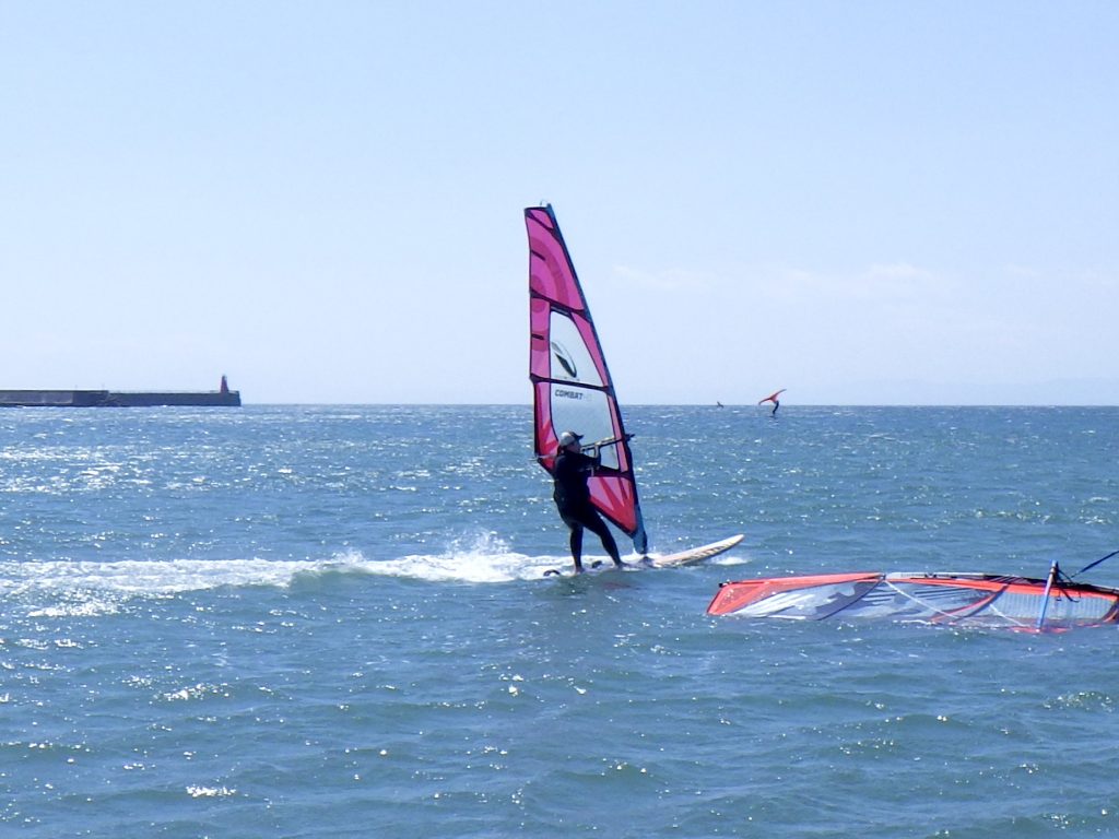 それでもブローを見つけて、頑張って走らせてみます。が、急に風がなくなって落ちてしまったり、急な強風で煽られてセイルを開かされたり、とにかく難しい1日でした